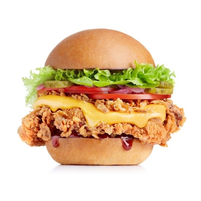 Идеальный гамбургер: котлета из говядины, соленый огурец, классический соус, листья салата, булочка. Вкус дополняет обжаренный хрустящий бекон.