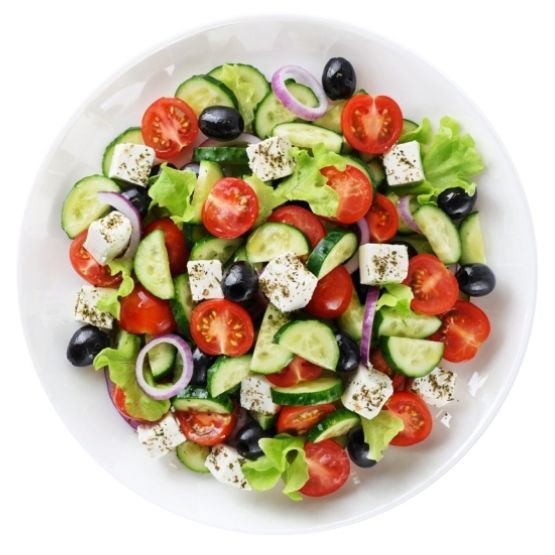 Легкий витаминный салат из овощей с сыром сиртаки. Огурцы, томаты черри, красный лук, оливки, сыр.