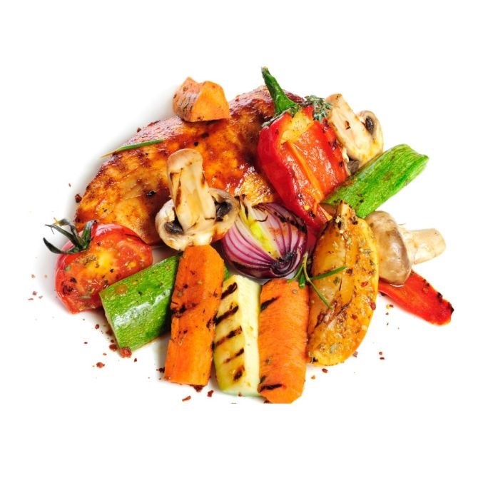 Кабачки, сладкий перец, томаты, морковь, шампиньоны, запеченные на гриле.