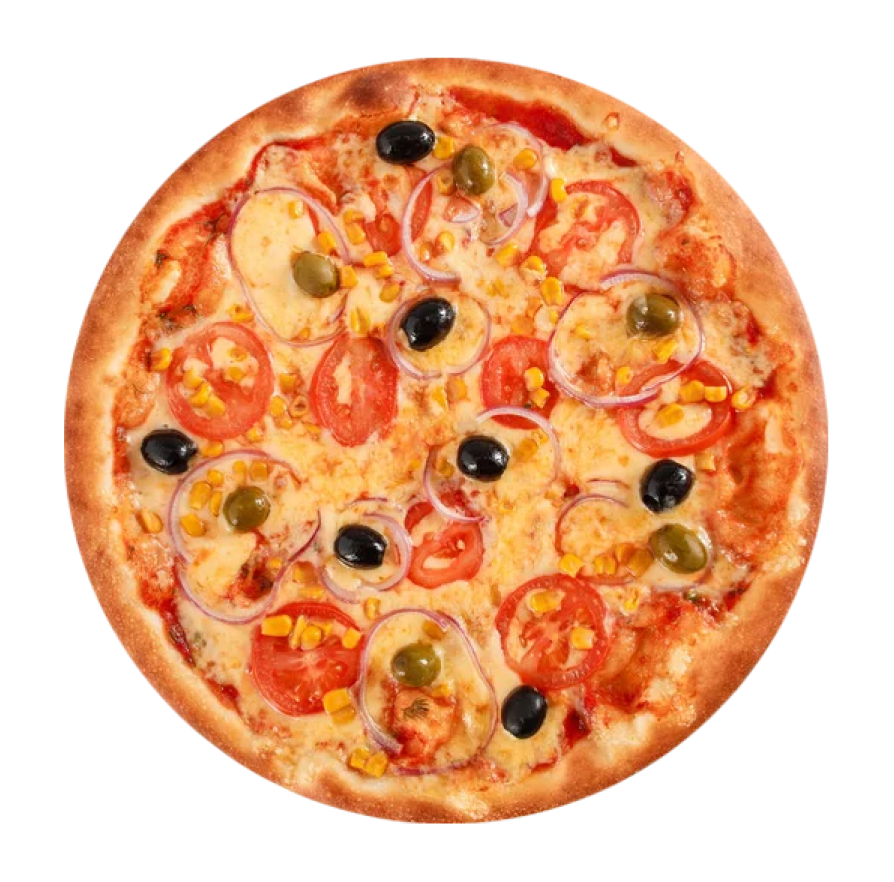 Классический вкус, 30 см, тонкое тесто, томат, моцарелла, кукуруза, лук, оливки, соус.
