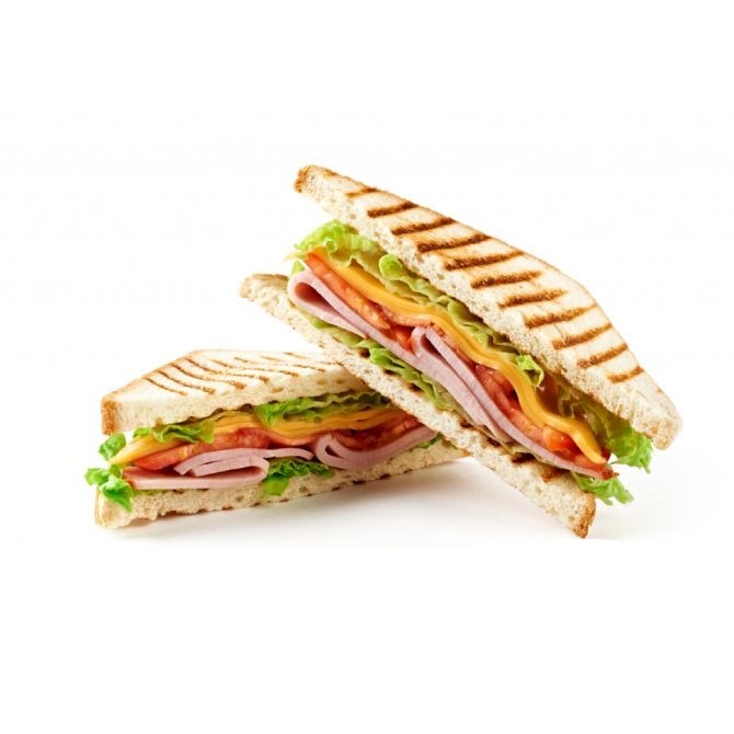 Цельнозерновой хлеб, ветчина, чеддер, пикантный соус, листья салата, томат.