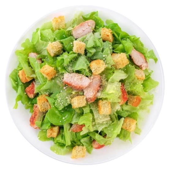 Пикантный салат с обжаренным на гриле куриным филе, томатами, сыром пармезан, заправленный классическим соусом Цезарь.